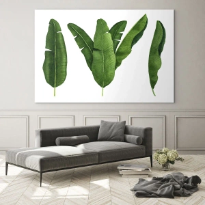 Cuadro mural - Simetría Verde - Cuatro hojas de plátano verdes sobre fondo blanco