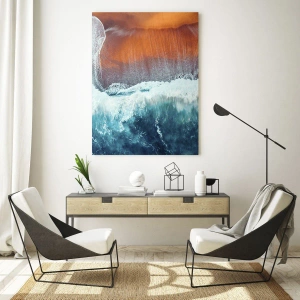- Una vista aérea del océano turquesa contrasta con la playa naranja. El dinamismo de las olas y la calma de la costa crean una composición única y energizante, perfecta para interiores modernos.