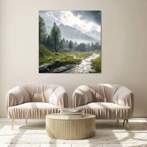 Cuadro sobre vidrio - Impresiones sobre Vidrio - Un paisaje montañoso con un río y árboles rodeados de montañas brumosas. - 80x120cm - De ida y vuelta - Decoración de pared moderna para salón y dormitorio ARTTOR