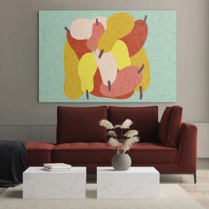 Cuadro sobre vidrio - Impresiones sobre Vidrio - Peras coloridas en un estilo gráfico sobre un fondo turquesa. - 50x70cm - Saborear el sol del verano - Decoración de pared moderna para salón y dormitorio ARTTOR