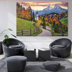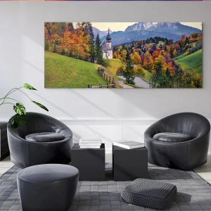Cuadro sobre vidrio - Impresiones sobre Vidrio - Paisaje otoñal de montaña con una iglesia y una carretera que atraviesa las colinas. - 100x70cm - Paisaje como una pintura - Decoración de pared moderna para salón y dormitorio ARTTOR