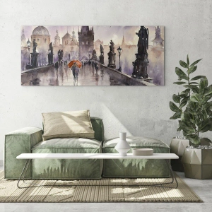 Las siluetas características de los edificios y estatuas en el puente añaden monumentalidad y profundidad artística, mientras que los reflejos sobre la superficie húmeda crean un efecto de fluidez y movimiento. La pintura captura a la perfección la atmósfera de la lluvia: un momento de reflexión, cercanía y romanticismo. Esto hace que esta pintura para sala de estar sea perfecta para decorar espacios diseñados para promover la tranquilidad y el buen ambiente.