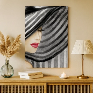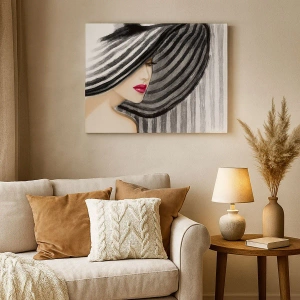 Cuadro sobre lienzo - Impresión de Imagen - Mujer con un sombrero blanco y negro con acento rojo. - 70x50cm - ¿Dónde puedo encontrarte? - Decoración de pared moderna para salón y dormitorio ARTTOR