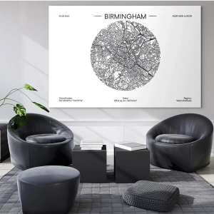 El cuadro Anatomía de Birmingham es un mapa gráfico que representa el trazado urbano de la ciudad en forma de una composición en blanco y negro. El estilo minimalista enfatiza la geometría y la estructura del espacio, creando un toque elegante y moderno.