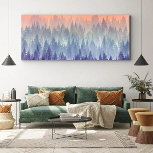 Cuadro sobre lienzo - Impresión de Imagen - Un bosque brumoso en tonos morados y naranjas. - 120x50cm - Alto, más alto, hasta el cielo - Decoración de pared moderna para salón y dormitorio ARTTOR