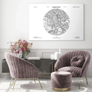 El cuadro titulado "Anatomía de Cracovia" es una elegante decoración que representa un mapa de Cracovia en forma de ilustración en blanco y negro con un alto nivel de detalle. La composición en un marco circular captura a la perfección la disposición de las calles y los edificios de la ciudad, creando un gráfico efectivo dominado por líneas y formas geométricas. El contraste en blanco y negro le da al cuadro un carácter minimalista y lo hace armonizar a la perfección con ambientes modernos.