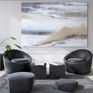 - Esta pintura representa una abstracción pictórica en tonos beige, blanco y azul. La composición evoca un paisaje invernal, aportando armonía y tranquilidad al interior. Perfecta para espacios modernos y tranquilos.
