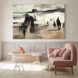 Cuadro sobre vidrio - Impresiones sobre Vidrio - Siluetas caminando por una amplia playa bajo un cielo nublado - 100x70cm - Un sueño evocado - Decoración de pared moderna para salón y dormitorio ARTTOR