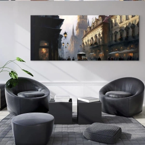 - Una calle histórica en el ambiente nocturno de Praga, con su arquitectura histórica y su evocadora iluminación. La pintura captura el romanticismo y la nostalgia de los paseos urbanos de antaño.