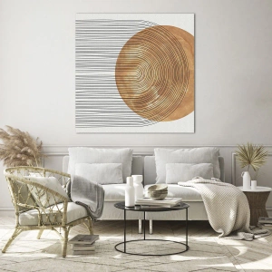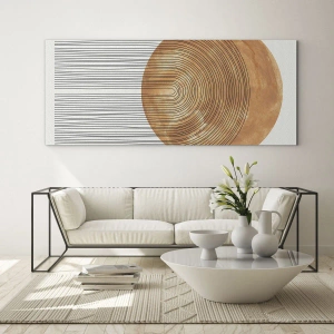 Cuadro sobre vidrio - Impresiones sobre Vidrio - Forma geométrica con líneas concéntricas y un círculo dorado. - 70x50cm - Una composición soleada - Decoración de pared moderna para salón y dormitorio ARTTOR