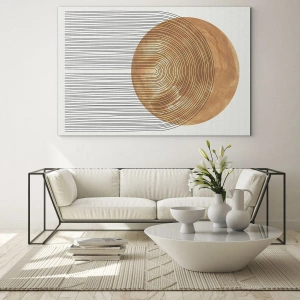 El cuadro "Composición Solar" es un ejemplo de minimalismo refinado, donde la forma geométrica y la línea crean un conjunto armonioso. El motivo central es un círculo en un cálido tono dorado, intersectado por líneas concéntricas que irradian hacia la izquierda. Este motivo evoca tanto el movimiento de la energía como la estructura de la madera o los patrones naturales en la arena. El uso de medios expresivos sencillos permite una estética de alto nivel y un carácter moderno a la composición. Esta obra, gracias a su forma, evoca una sensación de equilibrio y paz.