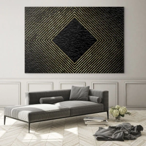 Cuadro sobre vidrio - Impresiones sobre Vidrio - Fondo negro con un patrón geométrico de líneas doradas. - 80x120cm - Geometría al estilo glamour - Decoración de pared moderna para salón y dormitorio ARTTOR