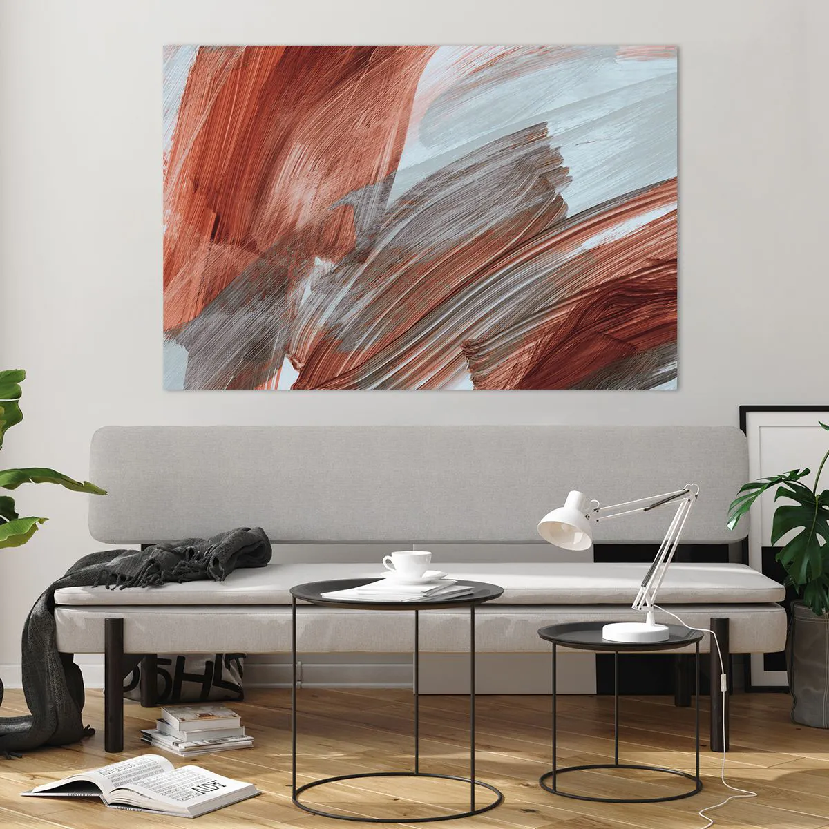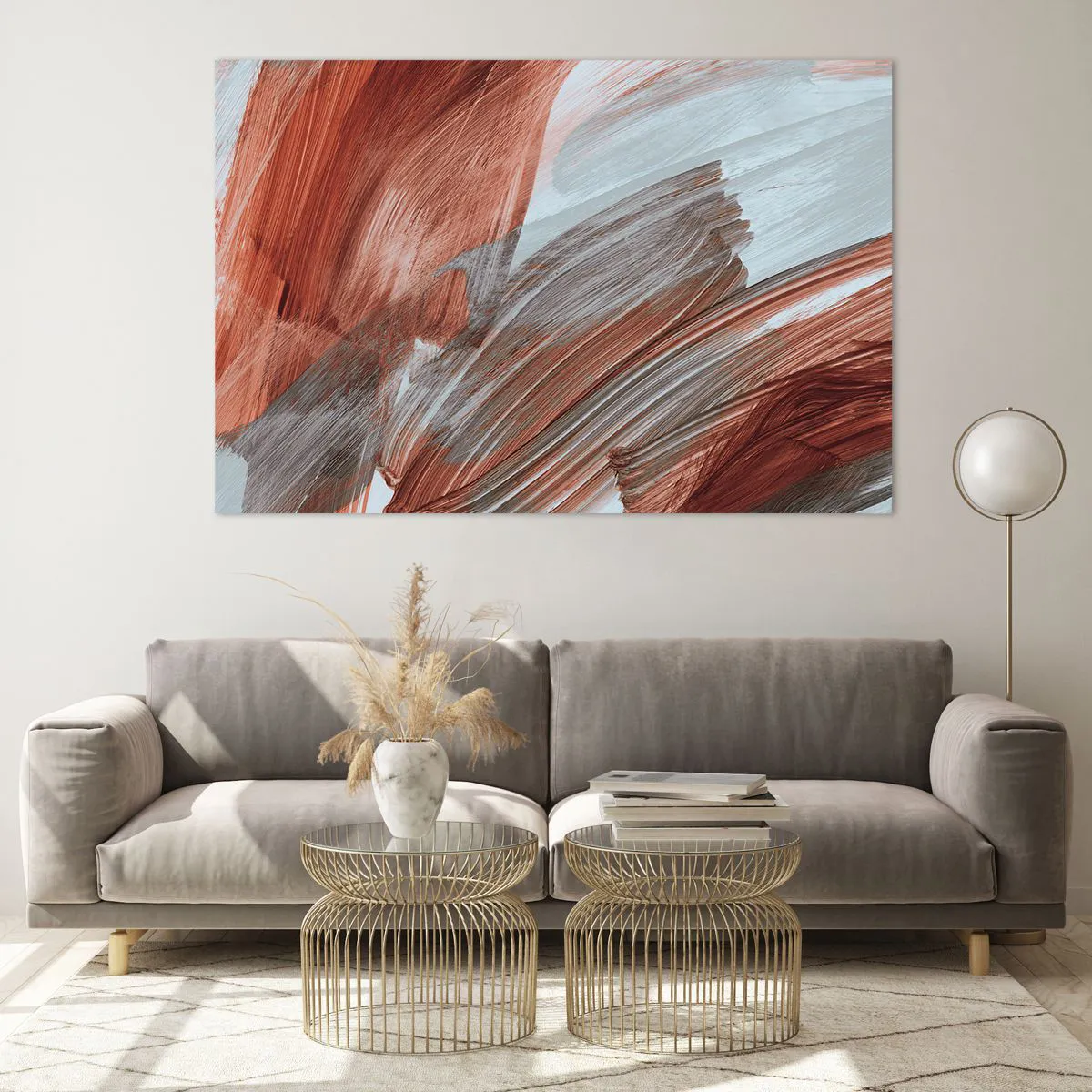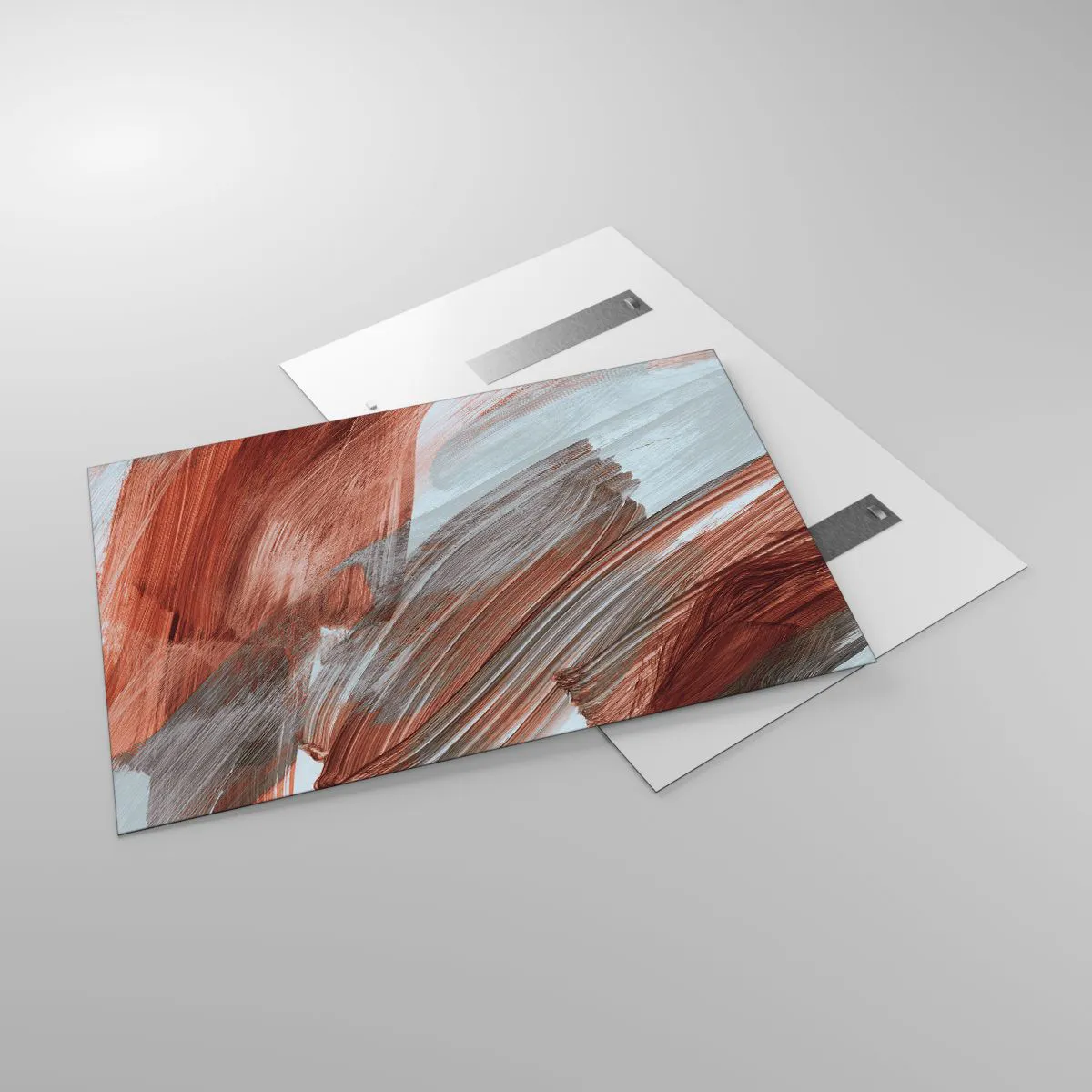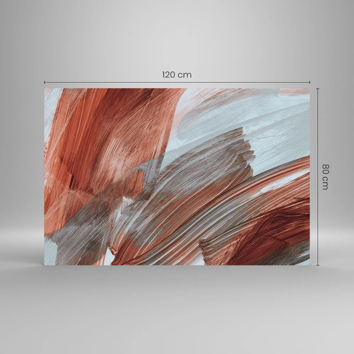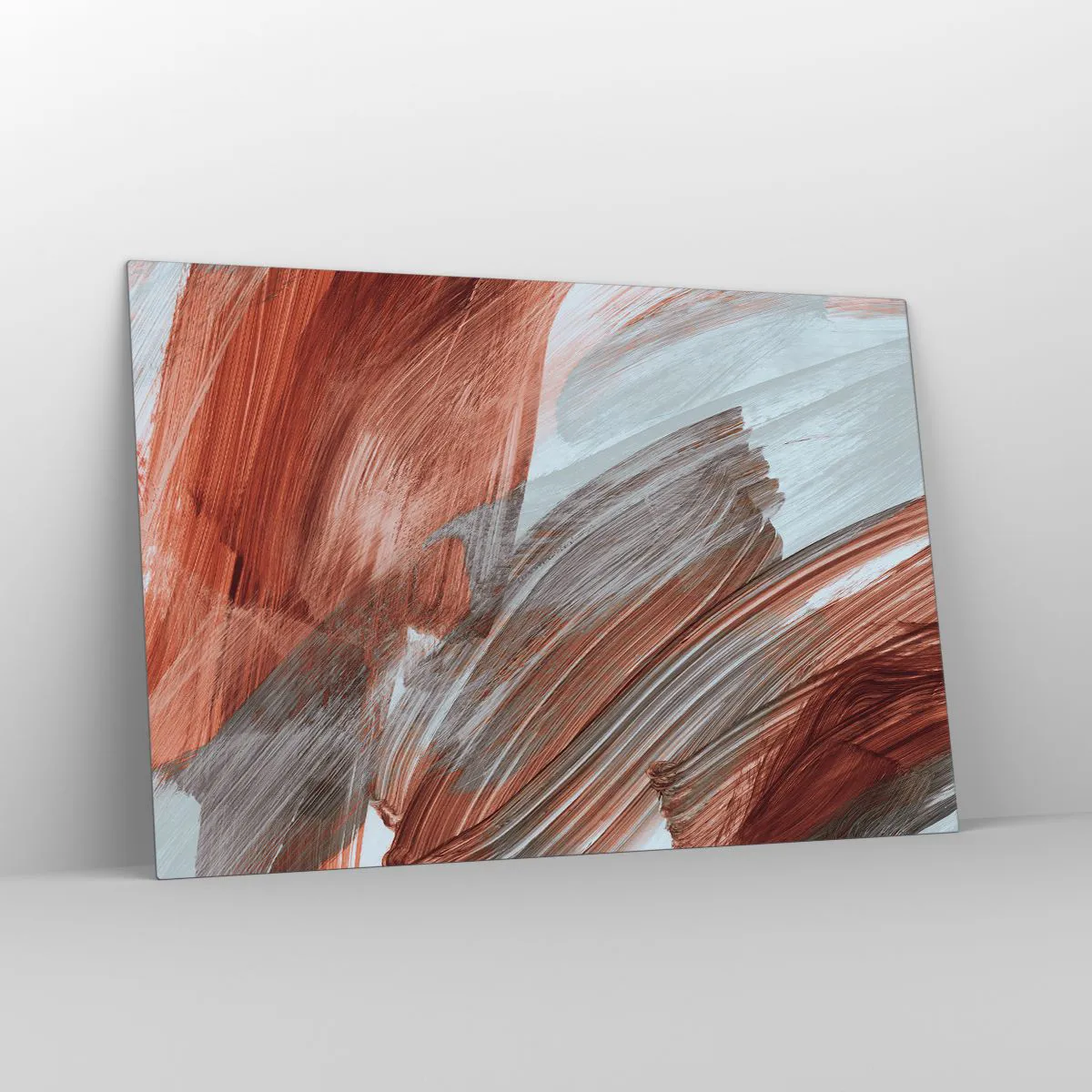 Cuadro sobre vidrio - Impresiones sobre Vidrio - Pinceladas dinámicas en cálidos colores otoñales y azules fríos. - 120x80cm - Abstracción otoñal y ventosa - Decoración de pared moderna para salón y dormitorio ARTTOR
