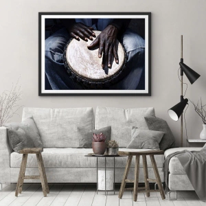 Póster en marco negro - Manos tocando un tambor djembé en un juego de ritmo - 50x70cm - Vive a tu ritmo - Decoración de pared moderna para salón y dormitorio ARTTOR