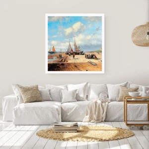 Póster - Barcos de pesca tradicionales y pescadores en una playa de arena - 50x70cm - Después de una pesca exitosa - Decoración de pared moderna para salón y dormitorio ARTTOR