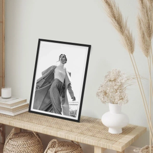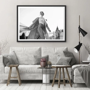 Póster en marco negro - Mujer elegante con abrigo frente a un fondo arquitectónico en blanco y negro - 100x70cm - ¿Vienes conmigo? - Decoración de pared moderna para salón y dormitorio ARTTOR
