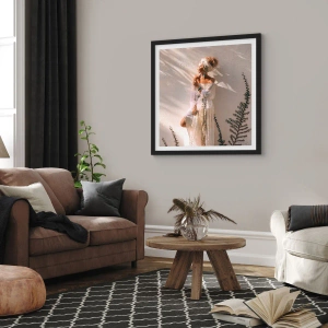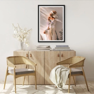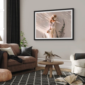 Póster en marco negro - Mujer elegante con un vestido boho frente a una pared clara - 50x70cm - El sol y la joven - Decoración de pared moderna para salón y dormitorio ARTTOR