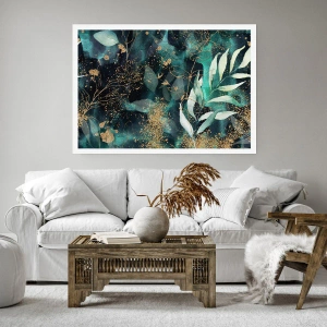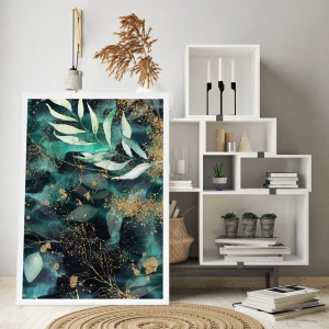 Póster - Hojas verdes y acentos dorados sobre un fondo oscuro. - 50x70cm - Jardín encantado - Decoración de pared moderna para salón y dormitorio ARTTOR