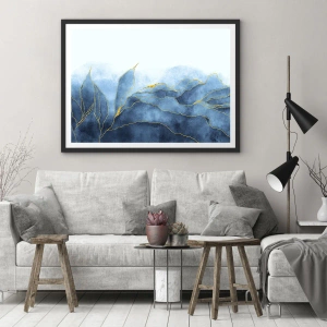 Póster en marco negro - Ondas abstractas en tonos azules con acentos dorados. - 100x70cm - Oro y azul - Decoración de pared moderna para salón y dormitorio ARTTOR