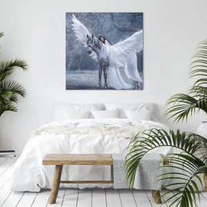 - Esta pintura representa a una mujer sobre un caballo blanco alado, rodeada de la mágica atmósfera de un bosque. Es la decoración perfecta para interiores que buscan incorporar un toque de misticismo y la belleza de la naturaleza.