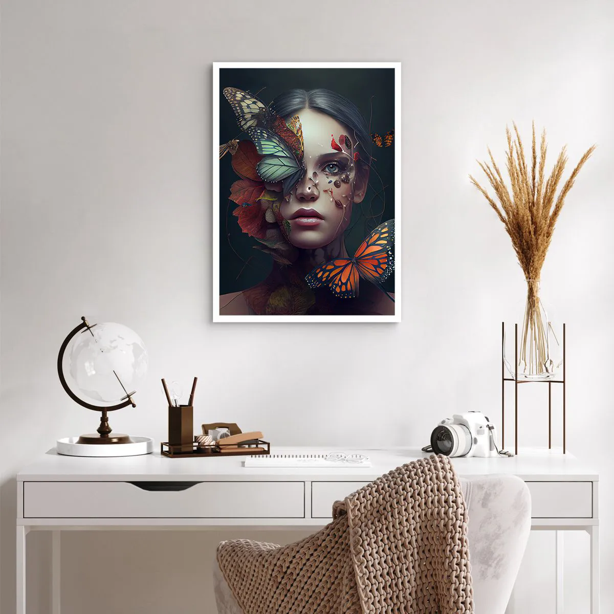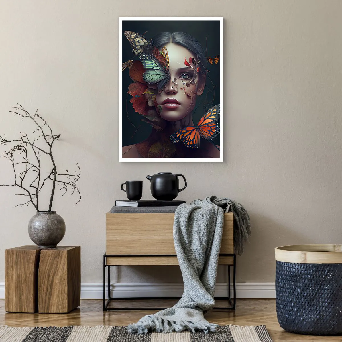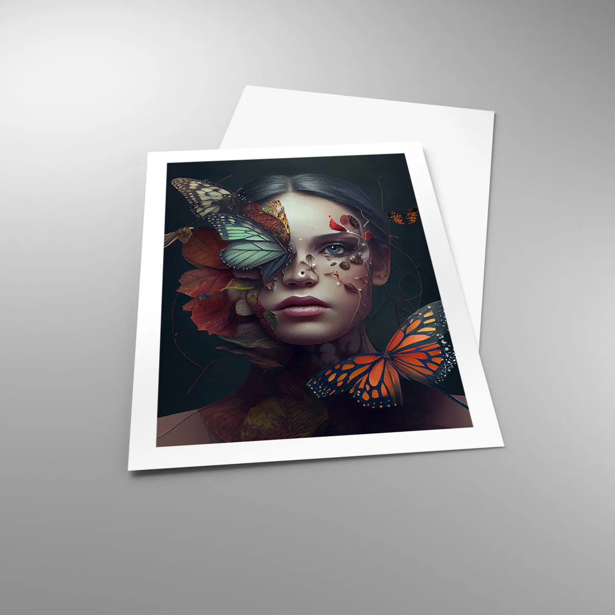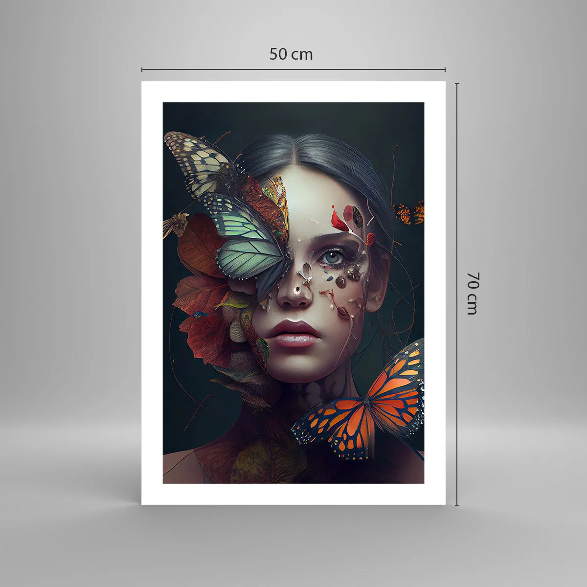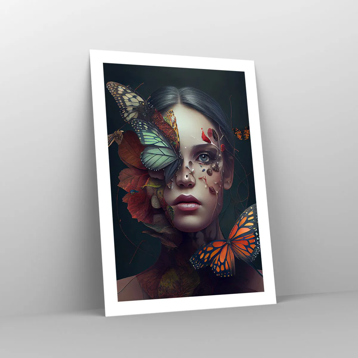 Póster - Retrato de una mujer con mariposas y hojas. - 50x70cm - Una metamorfosis maravillosa - Decoración de pared moderna para salón y dormitorio ARTTOR