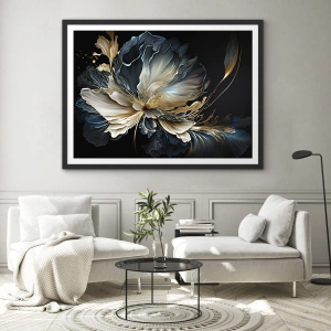 Póster en marco negro - Una flor en tonos dorados y azul marino sobre un fondo negro. - 100x70cm - Flor de helecho de cuento - Decoración de pared moderna para salón y dormitorio ARTTOR