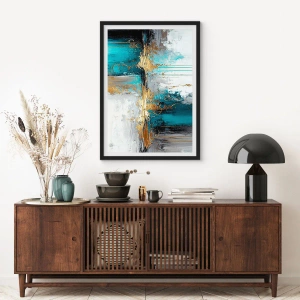 Póster en marco negro - Una composición abstracta con acentos turquesa y dorado. - 70x50cm - Todo fluye - Decoración de pared moderna para salón y dormitorio ARTTOR