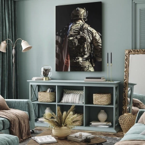 Cuadro sobre lienzo - Impresión de Imagen - Un soldado uniformado con una bandera sobre un fondo oscuro. - 120x50cm - Por eso lucho - Decoración de pared moderna para salón y dormitorio ARTTOR