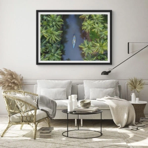 Póster en marco negro - Vista aérea de un barco flotando en un río tropical. - 50x70cm - En un sendero tropical - Decoración de pared moderna para salón y dormitorio ARTTOR