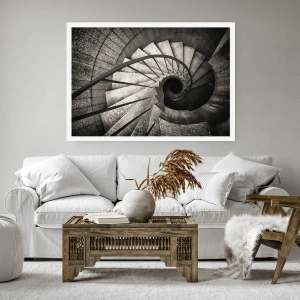 Póster - Fotografía en blanco y negro de una escalera de caracol desde arriba. - 50x70cm - Escaleras arriba, escaleras abajo - Decoración de pared moderna para salón y dormitorio ARTTOR