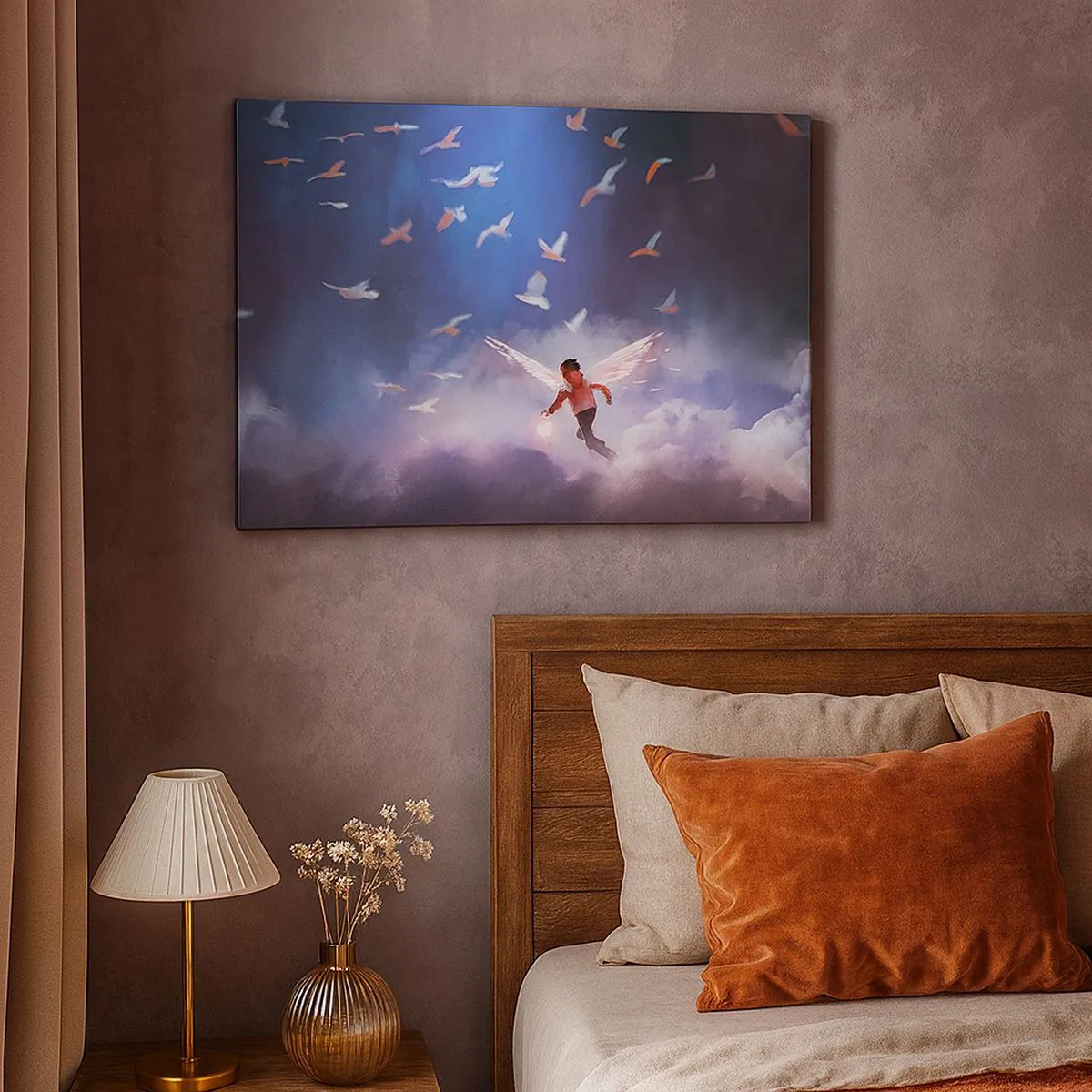 Cuadro en lienzo "Necesitas imaginación y coraje" es una composición única que combina elementos de fantasía y arte sutil. Representa una figura con alas de ángel, flotando rodeada de pájaros contra un cielo mágico de fondo, creando una escena armoniosa e inspiradora.