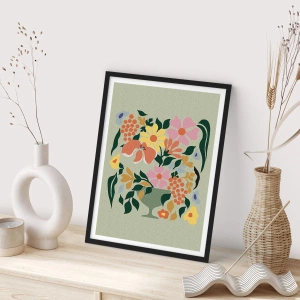 - El póster presenta un colorido ramo de flores en un jarrón decorativo sobre un fondo verde. Una composición elegante y artística, perfecta para interiores bohemios y retro. Incluye un marco negro.