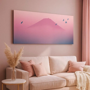 Cuadro sobre lienzo - Impresión de Imagen - Paisaje minimalista con montaña y pájaros al amanecer. - 70x50cm - Sobre las nubes - Decoración de pared moderna para salón y dormitorio ARTTOR