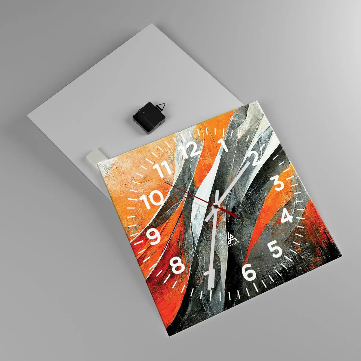 El reloj está vidrio con un espesor de 4mm. La tecnología de fabricación cumple con la clase de seguridad 2B2 según la normativa PN-EN 12600:2004 que garantiza la resistencia al impacto. El reloj de cristal está listo para ser instalado en la pared, tiene un colgador de metal fijado en la parte posterior del reloj y un espaciador de espuma para regular la distancia entre el reloj y la pared. El reloj tiene un mecanismo de flujo silencioso que funciona con una pila de 1,5 V - AA (pila no incluida).