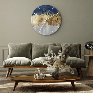 - El reloj presenta una composición abstracta en tonos dorados, plateados y azul intenso. Los reflejos difusos crean una sensación de lujo y profundidad, añadiendo un toque decorativo elegante y moderno al interior.