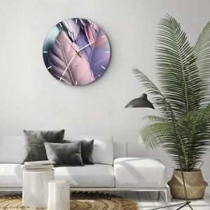 - Un reloj con un motivo de plumas pastel en tonos rosa, morado y menta. Una decoración ligera y elegante para un dormitorio o salón romántico.