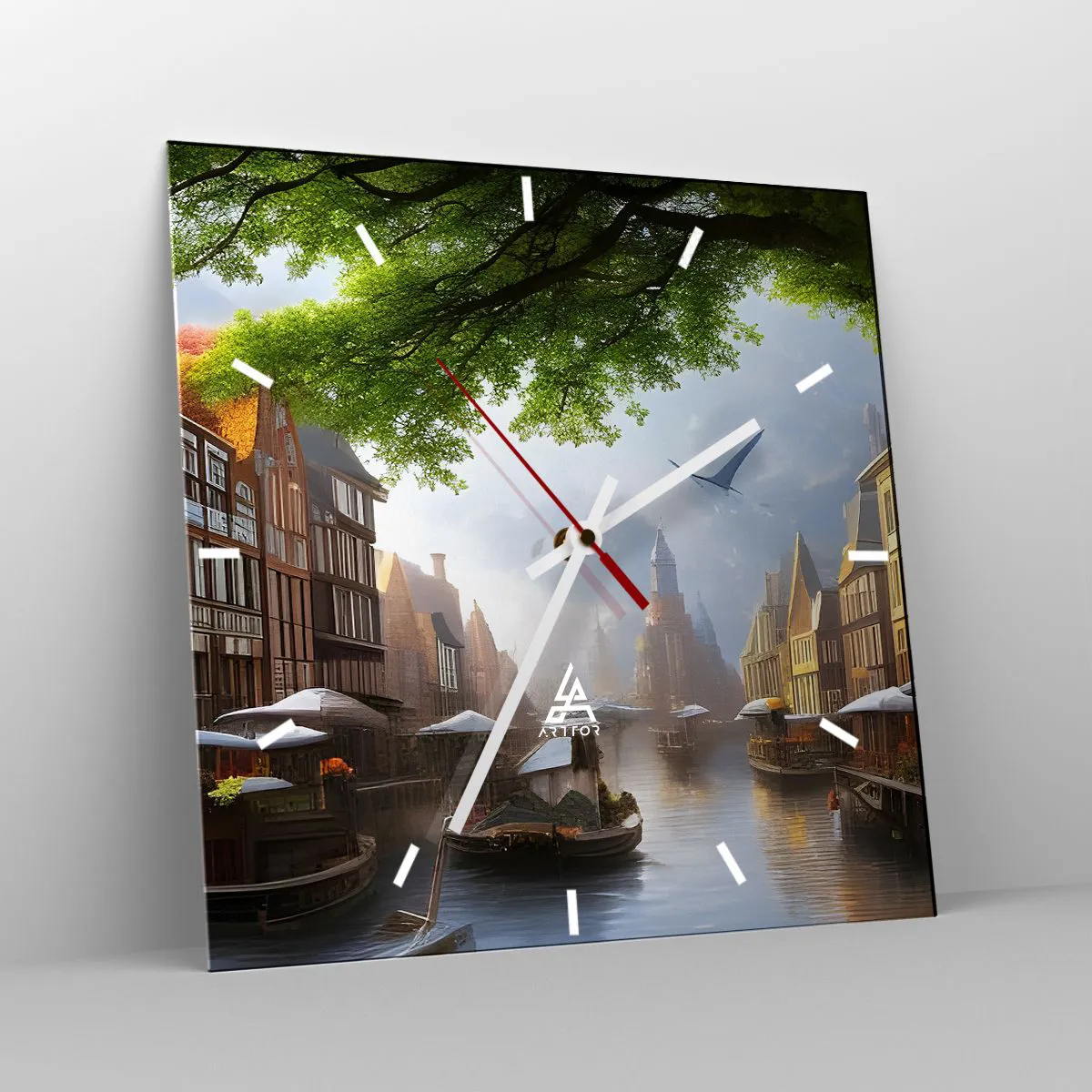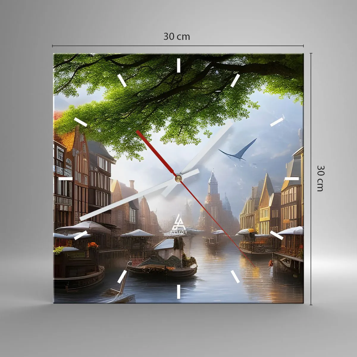 Reloj de pared - Reloj de vidrio - Un pintoresco paisaje holandés con un canal y casas de vecindad. - 30x30cm - Paisaje urbano holandés - Decoración de pared moderna para salón y dormitorio ARTTOR