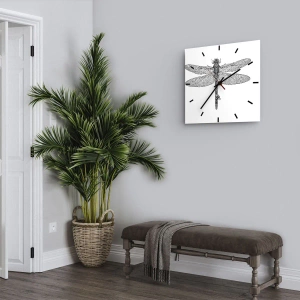 Reloj de pared - Reloj de vidrio - Dibujo en blanco y negro de una libélula sobre un fondo blanco en estilo minimalista. - 30x30cm - Precisión de la naturaleza - Decoración de pared moderna para salón y dormitorio ARTTOR