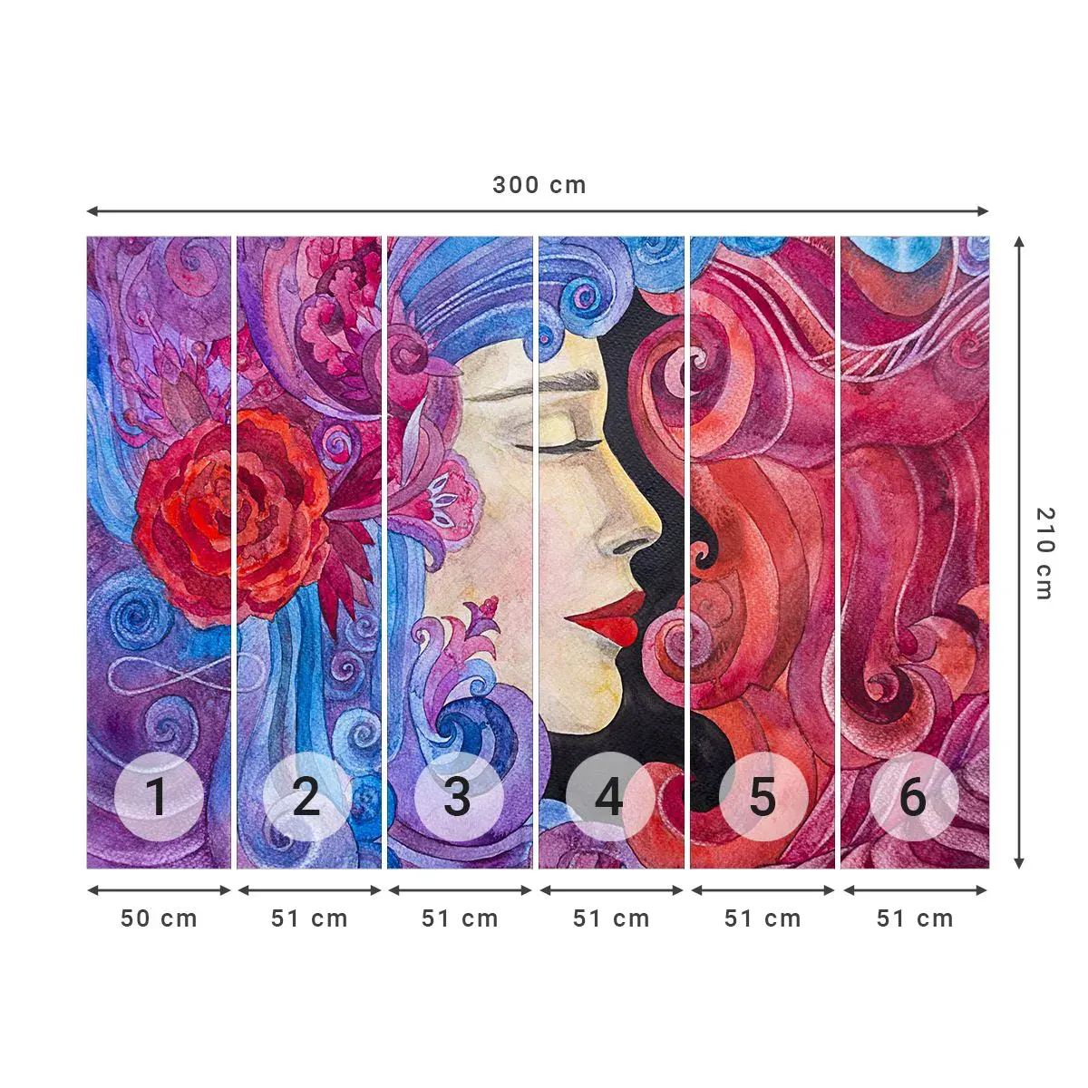 Fotomural Autadhesivo Deluxe Sticker - Inspiración en rojo y violeta - Mujer, flores, Diosa - 300x210 cm