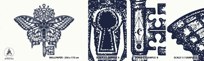 Muestra De Fotomural Standard Eco - Todos los secretos del corazón - Abstracción, Mariposa, Llave - 100x30 cm