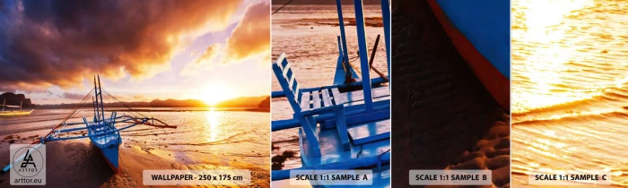 Muestra De Fotomural Standard Eco - Después de un largo día, relájate en la arena - Paisaje, Mar, Barco de pesca - 100x30 cm