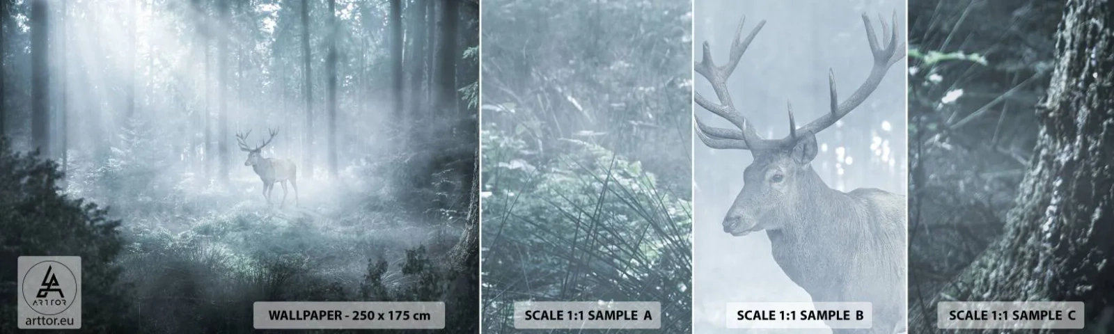 Muestra De Fotomural Standard Eco - Ronda matutina por la finca - Paisaje, Bosque, Ciervo - 100x30 cm