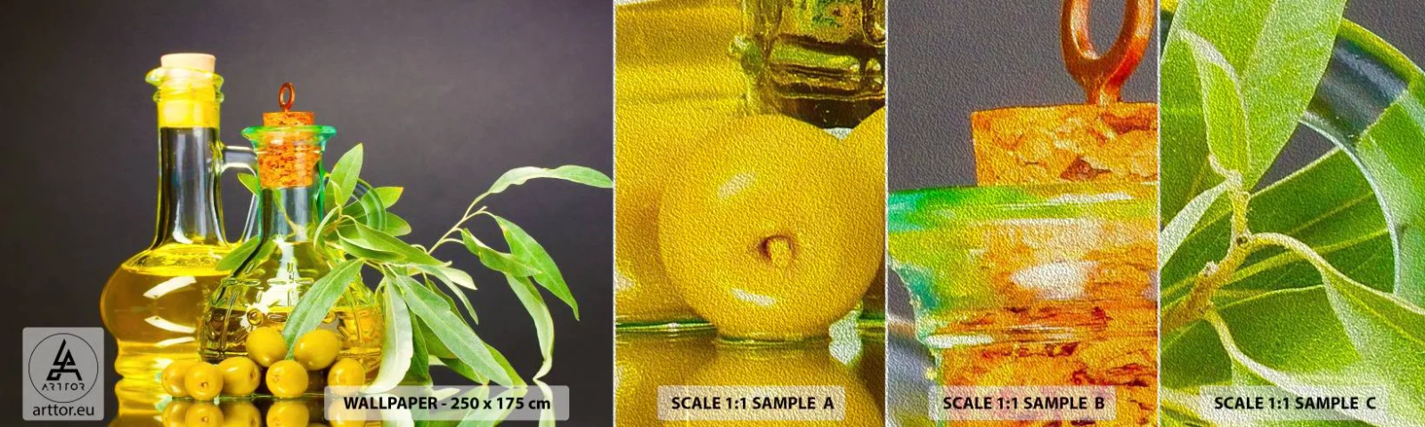 Muestra de fotomural Premium Sand - Bodegón con aceitunas y aceite - Gastronomía, Aceitunas, Aceite - 100x30 cm
