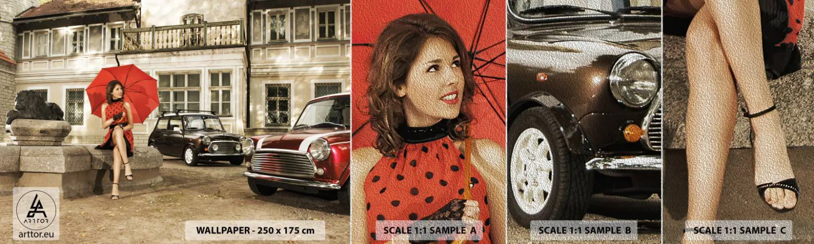 Muestra de fotomural Premium Sand - Un mini viaje sentimental - Mujer, Arquitectura, Auto - 100x30 cm
