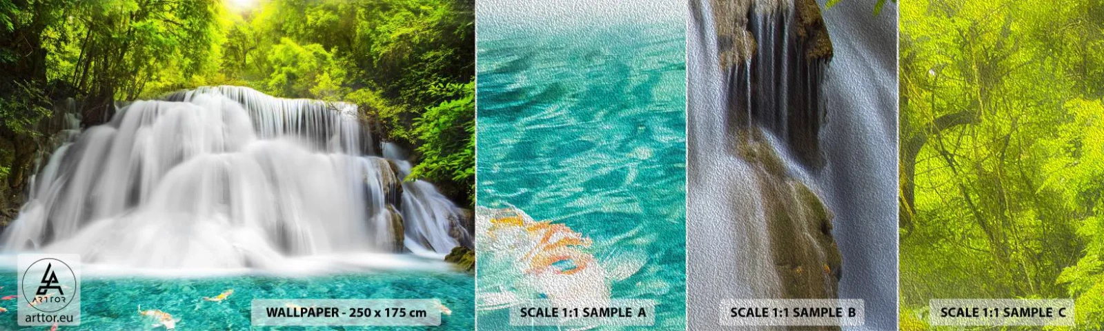 Muestra de fotomural Premium Sand - Cascada espumosa, de verde a azul - Paisaje, Cascada, parque Nacional - 100x30 cm