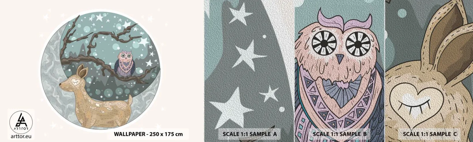 Muestra de fotomural Premium Sand - Noche de bosque de cuento de hadas - Para niños, Gráficos, Estrellas - 100x30 cm