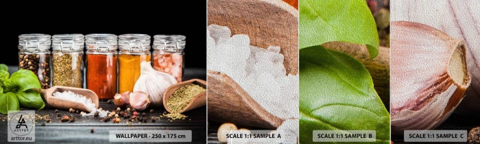 Muestra de fotomural Premium Sand - Para que la vida sepa bien - Gastronomía, Hierbas secas, Especias - 100x30 cm