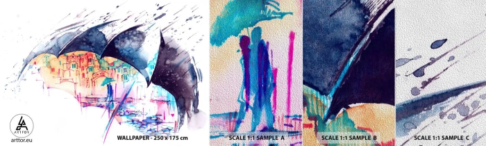 Muestra de fotomural Premium Sand - Caminando bajo la lluvia - Abstracción, Paraguas, Arquitectura - 100x30 cm