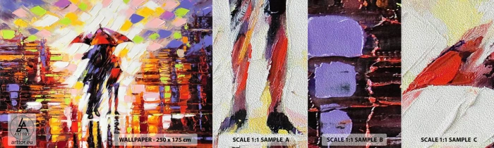 Muestra de fotomural Premium Sand - Juntos a través de la noche y la lluvia - Abstracción, Pareja enamorada, Caminar en la lluvia - 100x30 cm