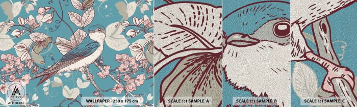 Muestra de fotomural Premium Sand - En el cerezo - Abstracción, Tragar, Pájaro - 100x30 cm